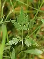Japanese hedge parsley typically grows between 2–4 feet tall during its second year of growth.[3] The leaves of Japanese hedge parsley are fern-like, alternate, divided pinnately, and have very slim stems that support each leaf.[6] The plant doesn't flower until its second growth year in June–August [4] and the flowers are white with five petals in multiple broad domed umbels.[6] The flowers are bisexual in the epicenter and a stamen is located at the margins of the umbels.[6] There are five stamens that alternate with the petals of the flowers and the ovary is located below.[6] Japanese hedge parsley can be described as unspecialized and self-fertile, and very attractive to pollinators.[6]