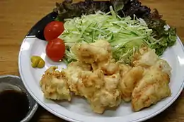 Toriten is a Japanese Tempura style fried chicken. It originated food in Ōita Prefecture, and is very popular there. Any part of the chicken can be used. The meat is cut into small pieces, dipped in soy sauce, sake and garlic powder, rolled in tempura powder and deep fried. Toriten is commonly served with fresh greens, and eaten hot immediately after frying. The most common sauce is Ponzu sauce (made with Soy sauce and vinegar) with mustard. In Oita, it is also popular to eat with a Kabosu-based sauce.