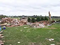 Large tornado. Near Vayland, several farmsteads were damaged. A mobile home was flipped and destroyed, a grain storage building was flipped onto a car, and several homes had significant roof and window damage. Numerous trees were snapped as well. Near Wessington, the tornado struck a farm and destroyed a house and several outbuildings. Five large metal high-tension truss towers were toppled in that area as well. Several farms near Wolsey were completely destroyed, and vehicles were thrown up to 50 feet away from where they originated. Some of the vehicles were badly mangled, and a pickup truck was partially wrapped around a tree.[12] Trees were snapped and debarked, power lines were downed, livestock was killed, and a small highway bridge was severely damaged before the tornado dissipated near Huron. Overall, 8 homes were destroyed, and several others were damaged. Aerial survey revealed cycloidal scour marks in farm fields. Two people were injured.[13][14] | |