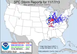 ![]() Storms associated with the outbreak over the Midwest United States on November 17 | |