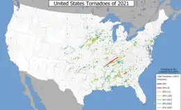 ![]() Map of the 2021 United States tornado paths from the results of preliminary surveys | |