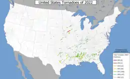 ![]() Map of the 2022 United States tornado paths from the results of preliminary surveys | |
