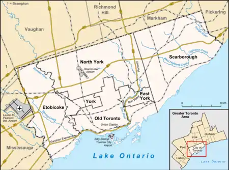 | Waterways | Black Creek, Burke Brook, Don River, Etobicoke Creek, German Mills Creek, Humber River, Keating Channel, Mimico Creek, Rouge River, Taylor-Massey Creek |