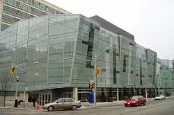 Ryerson University Library serves as the main academic library for the university, and is housed in an 11-storey Brutalist-style structure that was completed in 1974.[56] As of 2012, the library's collection held over 522,000 books, over 836,000 microform units, and provide access to electronic resources including e-books, serial titles, and databases.[57] In 2015, the Student Learning Centre was completed adjacent to the library building.[58] The 14,200 square metres (153,000 sq ft) Student Learning Centre was designed by the architectural firm Snøhetta, and was built to augment the library by providing additional study space; although no books from the university's collection are stored in the Student Learning Centre.[56][58]