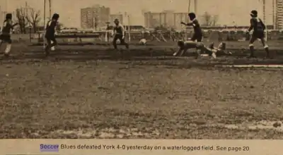 The 1972 squad was a mix of old and new players: Mario Da Rosa, Vito Polera, Vince Ierullo, Bob Cazzola, Tim Burns, Joe Dattolico, Bruno Bruni as well as a Peter Hillier, Ian Harris, Eugene Konarsky, Ed Cortes and John Cobby. By 1972, the OUAA soccer East division included Ryerson, Queen's, York, Trent, Carleton while the West was made up of McMaster, Toronto, Waterloo, Western, Guelph, Laurentian and Brock. Captained by Cazzorla, the Varsity Blues opened the season with a 3-0 win against Waterloo at Varsity Stadium. After five games played, the Varsity Blues had won three and drawn two and had only allowed 2 goals against. Eight games in, they had six wins and two draws and still only 3 goals against. The crucial game against McMaster was played at Varsity Stadium — the winning team assured of the West division title. The Marauders had 40 goals forward, the most in the league, while the Varsity Blues had the least against. The Varsity Blues won 1-0. In the final weekend of the regular season, the Varsity Blues defeated Guelph and Laurentian to finish atop the West division table with a 9-0-2 (W-L-T) record and 31 goals for and 7 against. The following weekend, on a York University field described by The Varsity (newspaper) as just "rain and mud", the Varsity Blues defeated York in the OUAA final and clinched a Nationals semi-final berth against Alberta. The Varsity said that "even York's twelfth man on the field — a huge defensive puddle halfway between the York goal and the centre line — offered little aid [to York in limiting the 4-0 Blues lead]". In the Varsity Blues first ever appearance at CIAU Nationals, they were defeated 2-0 by the Alberta Golden Bears at York University. This was their first defeat of the season. The Toronto school newspaper mentioned that the Varsity Blues had a "their first flat day [of the season]" and that "Alberta deserved its victory". The Golden Bears would go on to win in the final and become the 1972 National Champions.[14]