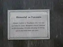 Torotoro was a Moriori resident of Kaingaroa in the Chatham Islands who was killed in a skirmish with Lieutenant Broughton's men of HMS Chatham (for which the island group was subsequently named for) over a dispute concerning his fishing gear on 29 November 1791. A memorial to Torotoro is above the beach at Kaingaroa.