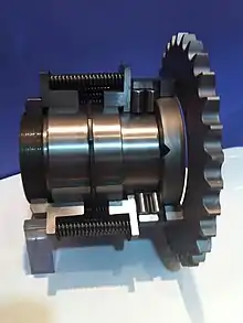 A ball detent type limiter transmits force through hardened balls which rest in detents on the shaft and are held in place with springs.[1] An over-torque condition pushes the balls out of their detents, thereby decoupling the shaft. It can have single or multiple detent positions, or a snap acting spring which requires a manual reset. There may be a compression adjustment to adjust the torque limit.