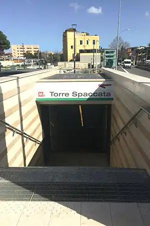 Torre Spaccata is an underground station of Line C of the Rome Metro. It is located at the intersection of the Via Casilina with Via di Torre Spaccata and Via di Tor Tre Teste. The stop serves the areas of Torre Spaccata, Alessandrino and Tor Tre Teste. Construction of the station started in 2007, and it was opened on 9 November 2014.