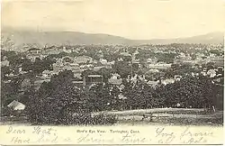 Torrington was first settled in 1735 by Ebenezer Lyman, Jr., of Durham, Connecticut. The downtown section of Torrington was known as Wolcottville, after the Wolcott family of Connecticut, which produced several governors between 1813 and 1881.[6] Its early settlers resided on the hills west of the Naugatuck River where the first school, church, store, and tavern were constructed. Later, the eastern hill known as Torringford was settled, as it provided the best farmland. Torrington was given permission to organize a government and incorporate as a town in October 1740. The town is named after Torrington in Devon, England.[7]