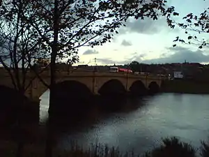 Torry is connected to the north bank of the Dee and the centre of Aberdeen by three bridges. Leading most directly to the centre of Torry, the Victoria Bridge was completed in 1887, following a ferry disaster in 1876 which claimed the lives of 32 people returning from a visit to the Bay of Nigg.[2] The bridge also has facilities for carrying water and gas services across the river. To the west of the Victoria Bridge lie the Queen Elizabeth Bridge of 1983, and the narrow Wellington Suspension Bridge. The suspension bridge was designed by Captain Samuel Brown and opened in 1831, replacing the Craiglug ferry. Refurbished in 1930, the Category A listed building was closed to vehicular traffic in 1984 and to pedestrians in March 2002. Aberdeen City Council engineers have strengthened the bridge, and have reopened it as a public footbridge.[3][4]