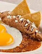 Totopo, in Mexican cuisine, is a flat, round, or triangular corn item similar to a tortilla, that has been toasted, fried or baked, but it may be prepared with nixtamalized corn masa. Totopos are best known as originating from Zapotec peoples of the isthmus of Tehuantepec region of the Mexican state of Oaxaca. There, the Zapotec women bake totopos in a clay oven known as a comixcal. Totopos resemble a round, baked tortilla chip or certain types of Scandinavian flat bread; however, unlike tortillas, salt is added to the masa and holes are made in the disk prior to baking.[1]