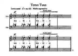 The libretto was taken from a poem written by contemporary writer Maria Boguslawska which is addressed to the Virgin Mary, the patron saint of Poland.[5] Totus Tuus's form is ABA'CD, and marks a return to the simple homophony characteristic of Górecki's earlier Marian Songs.[6] The composition's texture utilises homophony to allow for a clear voice for the libretto, while the simple chant form is repeated to slowly build a musical affirmation of faith. Gorecki used a homophonic texture in other Marian compositions such as 1985's Marian Songs, Op. 54, and Under your Protection, Op. 56.[6] This simplification of texture also occurs in Gorecki's most famous work, Symphony No. 3, where a similarly simple, diatonic language is employed to evoke the sparse and repetitive mood of Holy minimalism.[7]