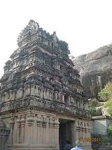 - Vettuvan Koil : is a Hindu temple built between the 8th and 9th century. Kalugumalai is a priceless unfinished Pandyan monolith cave temple, part of the iconographic richness that helped chronicle the burgeoning richness of the Tamil culture, traditions, and sacred centres containing religious art.[14] The temple is carved out from a single rock in a rectangular portion measuring 7.5 m (25 ft) in depth. The carvings in the temple show the top portion of the temple, with an unfinished bottom. The granite rock looks like a blooming lotus, with hills surrounding it on three sides. The vimana (ceiling over the sanctum) has niches of Parsavadevatas, the attendant deities of Shiva, like ganas, Dakshinamurthy depicted playing a mridanga, Siva with his consort Uma, dancers, various niches of Nandi (the sacred bull of Shiva) and animals like monkeys and lions.