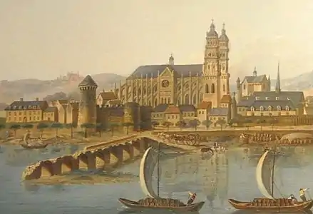 Three earlier cathedrals existed on the same site. The first, dedicated to Saint Maurice, was built by Bishop Lidorius from 337 to 371. It burned in 558, and was rebuilt by the Bishop Gregory of Tours and rededicated it in 590. Its location, at the south-west angle of the castrum, or old Roman walls, resulted in the cathedral entrance being part of the old Roman city wall.[3] Beginning in about 1160 another structure was begun, in the Angevin style. It was badly damaged by a fire, and never finished.[4]