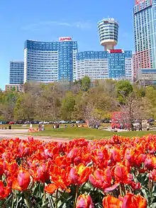 The Tower Hotel, opened in 1962, is located in the Fallsview district of Niagara Falls, Ontario and was the first of the contemporary observation towers built near the brink of the Falls. It features an indoor observation deck, restaurant, wedding chapel, and hotel. The tower is 99 metres (325 feet) tall above street level and 160 metres (520 feet) above the falls. The tower assumed its present name in 2010 as a result of its most recent renovation; as Minolta was the longest-tenured sponsor of the building, tourists and locals may still call it the Minolta Tower.