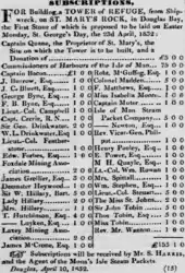 The cost of the construction of the tower amounted to £254 12 shillings.[3] There were 63 subscribers whose total donations amounted to £181 6 shillings, which left a balance of £73 6 shillings due to the builder and architect.[3] This sum was therefore met by Sir William, despite him and his family having already contributed £8.[3] Among the subscribers to the building of the tower were the Commissioners of the Isle of Man Harbours (£75), the Foxdale and Laxey mines (£2 each), the Mona Packet Company (£5), John Quane (£5), the Tobin family (£12). The average subscription was £1 and came from many of the well known Manx families. One particular donation was from Thomas Tobin who donated a St George's Ensign which had cost him £5.[3] This was the first flag to be flown from the tower on Thursday August 15, 1833.[4]