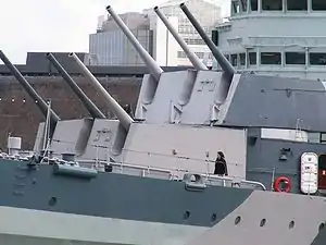 The Edinburgh class were longer at 614 ft (187 m) compared to 592 ft (180 m), initially to allow an increase in the main armament from twelve 6 in (152 mm) guns in four triple turrets as in the two previous sub-classes, to sixteen 6 in guns in four quadruple turrets. The idea was soon shelved however, due to the difficulties in actually manufacturing an effective quadruple 6 in turret, and so the class reverted to the original main armament design, although improved through a "long trunk" Mk XXIII turret design, which reduced the crew requirements and increased the speed of the ammunition hoists.[10] Four extra 4 in (102 mm) "High Angle Low Angle" guns and eight extra 2-pounder (40 mm) guns and further armour protection were added instead.