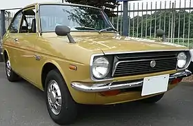 October 1970 saw minor changes to the range, including a new instrument panel, and a new High Deluxe version featuring the single-carburetor version of the 1.2 L engine and front disc brakes. A more substantial facelift took place in January 1972, when the KP30 Publica was given new front and rear fascias and a new "semi-fastback" style.[10] The U-engine model was dropped at this time, as the boxer unit could not clear emission standards anymore. 1973 saw the introduction of the Toyota Publica Starlet (designation KP40), a coupé version of the facelifted Publica. The last new version of the sedan was the KP50, a sedan version which featured the de-smogged 3K-U engine with 64 PS (47 kW). In June 1976 a five-speed transmission became available in the P50, the first Publica to be thus equipped.[12] The facelifted sedan continued in production until February 1978, when it was replaced by the KP60, marketed as the Toyota Starlet. The Van (sometimes referred to as a Utility Wagon by Toyota) was built until June 1979, while the Publica pickup was not withdrawn until August 1988. Later pickups were fitted with the desmogged 1,166 cc 3K-HJ (from November 1975) and then the 1,290 cc 4K-J engines (from June 1979), although export versions retained the 1-litre 2K engine. The pickup also received a five-speed gearbox from August 1985.[8]
