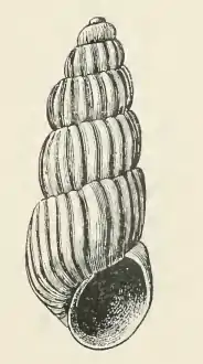The whorls of the teleoconch are rounded, and longitudinally lamellose. The aperture is semicircular, with an exterior rib. There is no apparent spiral sculpture. The apex is retrorse. The columella lacks a fold or tooth.[3]
