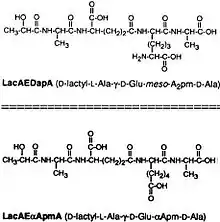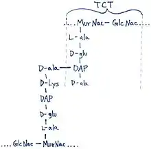 The DAP residue is responsible for directly bonding to the D-alanine peptide of another PGN molecule, thus aiding TCT's attachment within the cell wall.[6]