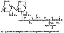 TCT is a soluble piece of peptidoglycan (PGN) found in the cell wall of all gram-negative bacteria.[4] Like all PGNs, TCT is composed of a disaccharide and a peptide chain. The IUPAC name for TCT is N-acetylglucosaminyl-1,6-anhydro-N-acetylmuramyl-(L)-alanyl-γ-(D)-glutamyl-mesodiaminopimelyl-(D)-alanine.[5] It is classified as a DAP (diaminopimelic acid)-type PGN due to the third amino group within the chain being a diaminopimelyl peptide.