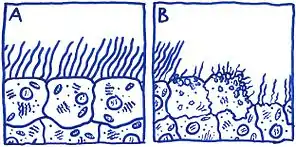 While previous studies using murine models reported evidence of TCT causing ciliostasis, in vitro studies using human tracheal cells have shown that TCT does not affect ciliary beat frequency of living cells, but instead causes damage and eventual extrusion of ciliated cells.[10] In gonorrhea infections, vaginal ciliated epithelial cells have also displayed the same cytopathogenic effects due to TCT recognition.[11] The extensive damage to ciliated epithelial tissue caused by TCT results in major disruption to the ciliary escalator; an important asset of the host's non-specific defenses. This disruption hinders the host's ability to remove mucous and foreign microbes from the epithelial tissue. Paroxysmal cough, e.g. whooping cough, is a direct symptom of said mucous build-up due to ciliated tissue damage.