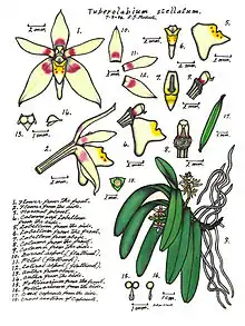 Trachoma stellatum, commonly known as the starry spectral orchid,[2] is an epiphytic or lithophytic clump-forming orchid with many thick roots. It has between three and eight thick, leathery leaves and many short-lived, cream-coloured flowers with purple markings and a yellow-tipped labellum. This orchid occurs in tropical North Queensland.