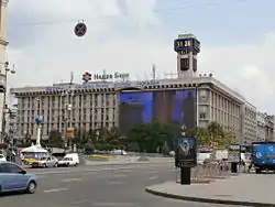 The Trade Unions Building, or Budynok Profspilok (officially in Ukrainian: Будинок спілок Федерації професійних спілок України, Union house of the Federation of Trade Unions of Ukraine), is a large office building in Kyiv, Ukraine. Located on the city's main Khreshchatyk Street, its façade faces the central Maidan Nezalezhnosti square and contains the city's main clock tower.
