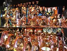 While copper was worked in some parts of Mesoamerica, modern Mexican tradition is Spanish in origin.[29] Copper working was initially ignored by the Spanish conquistadors as they were looking for gold and silver. It was not shipped to Spain as much as the other two. Instead, it eventually became important for the creation of utilitarian items, especially domestic items such as pots and pans.[15] Today, the center of traditional copper work in Mexico is the state of Michoacán, especially the municipality of Santa Clara del Cobre. One traditional hammered copper object is a large vessel in which pork fat is rendered or sugar caramelized for making candies. Every year during the month of August Santa Clara del Cobre holds a copper festival.[30]