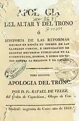 - full title Apología del altar y del trono ó Historia de las reformas hechas en España en tiempo de las llamadas Cortes, é impugnacion de algunas doctrinas publicadas en la Constitucion, diarios y otros escritos contra la religion y el Estado