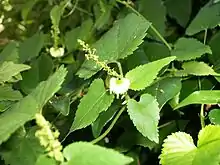 A much-branched climbing perennial herb, with twining stems up to 2.5 m originating from a woody rootstock.[5] The leaves are hairless or thinly hairy with serrated margins.[1] The hairs sting fiercely.[1] Inflorescences are up to 5.5 cm long with peduncles up to 2 cm long.[5] The inflorescences are composed mostly of tiny[1] male flowers with 1–2 female flowers below or else all male.[5]