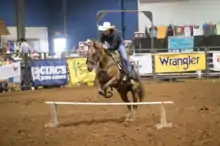 Trail Course is a rodeo event in which a horse and rider attempt to complete a series of obstacles in the fastest time. It combines the horse's athletic ability and the horsemanship skills of a rider in order to safely and successfully maneuver a horse through a series of five obstacles.[1] The rider must remain mounted the entire time. It is similar to Trail competition at horse shows, but with emphasis on speed rather than style.