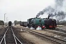 Steam locomotives work by using a boiler to heat water into steam, which powers the locomotive's pistons which are in turn connected to the wheels.[53] In the mid 20th century, most steam locomotives were replaced by diesel or electric locomotives, which were cheaper, cleaner, and more reliable.[54] Steam locomotives are still used in heritage railways operated in many countries for the leisure and enthusiast market.[55]