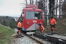 Simple repairs may be done while a train is parked on the tracks, but more extensive repairs will be done at a motive power depot.[39] Similar facilities exist for repairing damaged or defective train cars.[40] Maintenance of way trains are used to build and repair railroad tracks and other equipment.[41]