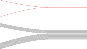 A switch in a train track models a point where two families of parallel curves in the lamination merge to become a single family, as shown in the illustration. Although the switch consists of three curves ending in and intersecting at a single point, the curves in the lamination do not have endpoints and do not intersect each other.