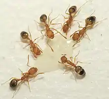 Ants have a more rigid list of criterion to be considered "true" tramp species. The most cited body of work outlining these traits comes from Luc Passera.[2] His primary and most important criterion is that the distribution of the species must be linked to human activities, what he refers to as "anthropophilic tendency".[2] He also lists the following traits as being likely common to all tramp species: small size, monomorphism of worker ants (worker ants having only one phenotype), high rates of polygyny, unicoloniality, strong interspecific aggressiveness, worker ant sterility, and colony reproduction by budding.[2] These traits may appear with more or less intensity among considered tramp species,[2] and in fact, literature does not currently require a tramp species to possess every single one of these attributes.[9] Ant tramp species in particular can be ecological indicators on the susceptibility of an ecosystem to become invaded[6] or ecological instability.[2]