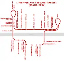 The Ebbelwei express is a special line running on a loop from "Zoo" to "Messe/Schleife" via Altstadt and Sachsenhausen. The Ebbelwei-Express is a sightseeing line which runs only on weekends. Historic "K-type" trams are in operation on this route. Lieschen was a special line which ran from "Riedhof" to "Oberforsthaus" occasionally, only during a public festival called "Wäldchestag". Wäldchestag is only once a year during Pentecost, so the Frankfurt transit company VGF dismissed this line and its tracks in 2013.