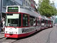 The Freiburg im Breisgau tramway network (also known as Stadtbahn or formerly as Hoobl (Alemannic for Hobel))[1] is a network of tramways that forms part of the public transport system in Freiburg im Breisgau, a city in the federal state of Baden-Württemberg, Germany. Established in 1901, the network has been operated since its foundation by the company now known as Freiburger Verkehrs (VAG Freiburg or VAG), and powered by electricity. The tramway network currently has five lines. The expansion of the tram network since 1980 has served as an example of the "renaissance of the trams" in Germany. As of 2021, 76 trams were available for regular use: 5 of these were high-floored, 36 partial and 35 low-floored. Almost the entirety of the network is located within Freiburg's urban area; only a few metres of the balloon loop at Gundelfinger Straße are located outside the boundary of Gundelfingen to the north of Freiburg. In total, the trams serve 20 out of the 28 districts in Freiburg.