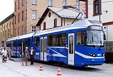 Pesa built 36 2014N "Krakowiak" trams between 2014 and 2015.[7] The first unit was delivered on 28 June 2015.[12] With a length of 42.8 m (140 ft 5 in) the Pesa 2014N "Krakowiak" is the longest tram in Poland.[12] They are equipped with air conditioning, passenger information system, ticket machines and bike stands.[12] The first "Krakowiak" entered service on 30 August 2015.[13]