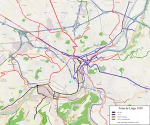 An aspect of tram operations in the city was the large number of competing operators. By the start of the twentieth century there had been some consolidation of the businesses involved, but in 1905 there were still six different organisations operating tram in Liège, some in public ownership and some privately owned. In addition to the electric trams the lines were also used by steam trams at this time. It was only in 1927 that the Liège tram network was "unified".[4]