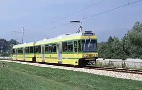 The Neuchâtel tramway currently has an exclusively high-floor tram fleet, mostly built in 1981, comprising six four-axle power cars of type Be 4/4 with the numbers 501–506 and four corresponding, externally identical control cars (Bt) with the numbers 551–554. These two vehicle types are derived from the Tram 2000 vehicles of the Forchbahn. All were built by SWS in 1981, except the last two powered cars, 505–506, which were built in 1988 and had bodies built by Schindler Waggon (DE) (to the same style as cars 501–504) and trucks by SIG.[4][6] The eight 1981 cars entered service on 29 June 1981,[11] replacing all of the surviving 1902 cars, which were permanently withdrawn at that time.
