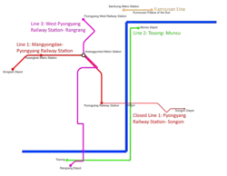 From 14 October 2002, the section of Line 1 between P'yŏngyang-yŏk and Songyo was closed,[3] as the bridge over Taedong River started to deteriorate,[5] splitting Line 1 into two parts divided by the Taedong River. The section from Songyo to Songsin was eventually replaced by a trolleybus in 2014. The part crossing the bridge was replaced by a bus service. Demolition of the tracks between Songyo and Pyongyang Station was completed by 9 September 2003.[6]