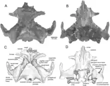 Tranatocetus is similar to "Aulocetus" latus, "Cetotherium" megalophysum, "Cetotherium" vandelli, Mesocetus, and Mixocetus in having rostral bones that override the frontals and contact the parietals, nasals dividing the maxillae on the vertex, a dorsoventrally bent occipital shield with a more horizontal anterior portion and more vertical posterior portion, and a tympanic bulla with short, narrow anterior portion with rounded or squared anterior end and wider and higher posterior portion that is particularly swollen in the posteroventral area. Like other tranatocetids, the skull vertex of Tranatocetus is X-shaped in dorsal view. However, Tranatocetus differs in having a wide skull with laterally expanded squamosals, straight ascending processes of maxillae which extend parallel to each other (rather than tapering and converging posteriorly), small lateral projection of the posterior meatal crest on the posterolateral side of the postglenoid process and paroccipital processes extending far posterior to the occipital condyles.[1]