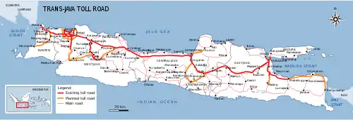 The Trans-Java Toll Road is a tolled expressway network that runs from Merak, northwestern end of Java to Banyuwangi, the eastern end of the island in Indonesia. The toll road connects all major cities of the island. The total length of the road is 1,167 kilometres (725 mi).[1]