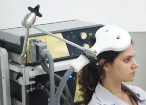 During the procedure, a magnetic coil is positioned at the head of the person receiving the treatment using anatomical landmarks on the skull, in particular the inion and nasion.[12] The coil is then connected to a pulse generator, or stimulator, that delivers electric current to the coil.[2]