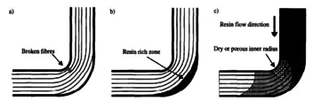 Sharp corners are the problems with all mold based manufacturing, including casting. Specifically in transfer molding corners can break fibers that have been placed in the mold and can create voids on the inside of corners. This effect is demonstrated in Figure 3 on the right. The limiting factor in these designs is the inner corner radius.[8] This inner radius limit varies depending on resin and fiber selection, but a rule of thumbs is the radius though be 3 to 5 times the laminate thickness.[8]