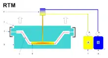Resin transfer molding (RTM) uses a liquid thermoset resin to saturate a fiber preform placed in a closed mold. The process is versatile and can fabricate products with embedded objects such as foam cores or other components in addition to the fiber preform.[3]