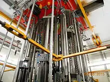 TREAT has three banks of control rod drive mechanisms, the control/shutdown rods, the compensation/shutdown rods, and the transient rods. There are 4 drive mechanisms in each group. The drive mechanisms are below the reactor, and raise the control rods out of the reactor to increase reactivity.[20] These banks of control rods are arranged in two rings. The inner ring contains four drive mechanisms, the compensation/shutdown rods, with one control rod for each drive mechanism. The outer ring has four control/shutdown drive mechanisms and four transient rod drive mechanisms. The control/shutdown and transient rod drive mechanisms have two control rods for each drive mechanism. All the control rods contain B4C poison sections. The compensation/shutdown and control/shutdown drive mechanisms are mechanical lead screw driven, and have use pneumatic pressure to assist the scram function. The four transient rod drives are hydraulically actuated, and are controlled by the Automatic Reactor Control System (ARCS) to control transients.[21] These transient rods move up to 170 in/sec over a total travel of 40 inches (i.e. full 40 inch stroke in about 0.24 seconds).[22]