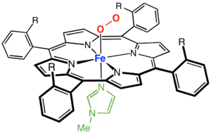 O2 adducts derived from cobalt(II) and iron(II) complexes of porphyrin (and related anionic macrocyclic ligands) exhibit this bonding mode. Myoglobin and hemoglobin are famous examples, and many synthetic analogues have been described that behave similarly. Binding of O2 is usually described as proceeding by electron transfer from the metal(II) center to give superoxide (O−