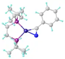Typical nitrile ligands are acetonitrile, propionitrile, and benzonitrile. The structures of [Ru(NH3)5(NCPh)]n+ have been determined for the 2+ and 3+ oxidation states. Upon oxidation the Ru-NH3 distances contract and the Ru-NCPh distances elongate, consistent with amines serving as pure-sigma donor ligands and nitriles functioning as pi-acceptors.[2]
